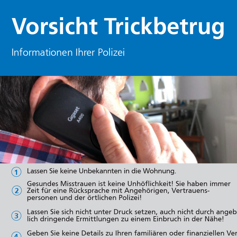 Seit mehreren Jahren rufen Betrüger potenzielle Opfer per Telefon an und geben sich als Enkelin oder Enkel, Polizeibeamte, Mitarbeiterin oder Mitarbeiter von Banken oder Staatsanwaltschaften aus. Sie versetzen Seniorinnen und Senioren durch erfundene Szenarien in Angst und Schrecken und horchen sie dabei bezüglich ihrer Vermögenssituation aus. Die Betrüger gehen sehr professionell vor und steigern nach und nach den Druck während des Telefonats.