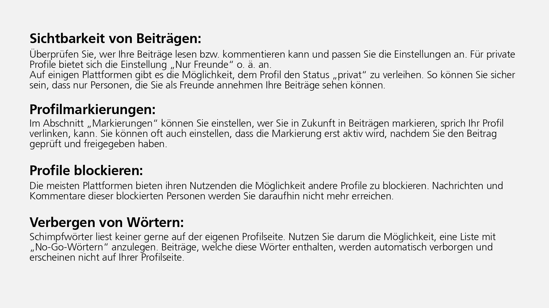 Im Idealfall schützen Sie sich durch die Wahl der richtigen Einstellungen ebenfalls vor sogenannten Hasspostings, Spaminhalten und Ähnlichem. Diese Inhalte können nicht nur das persönliche Sicherheitsgefühl empfindlich beeinträchtigen, sondern auch das tägliche Leben auf den Kopf stellen.