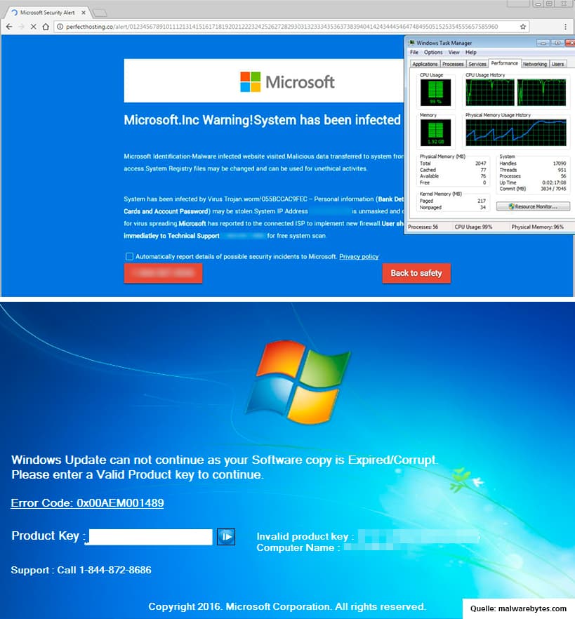 Der Kontakt zu den falschen Support-Mitarbeitern kann auf zwei Wegen hergestellt werden: