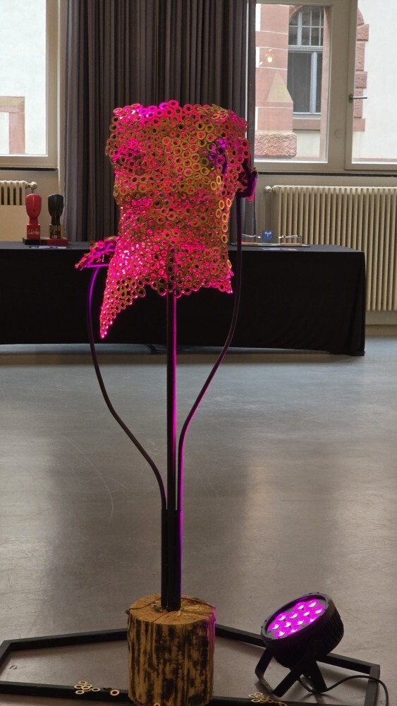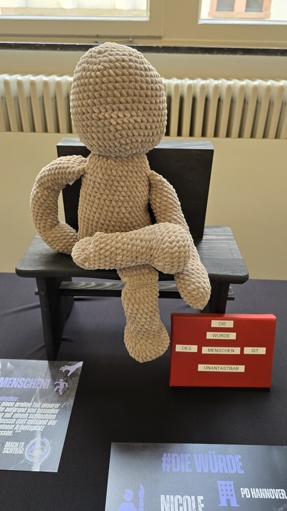 In der Ausstellung „MACH ES SICHTBAR - gegen sexuelle Belästigung und Diskriminierung am Arbeitsplatz“ haben Polizeibeamt:innen und Beschäftigte der Polizei Niedersachsen ihre persönlichen Sichtweisen oder Erfahrungen zu sexueller Belästigung und Diskriminierung am Arbeitsplatz künstlerisch verarbeitet und 32 Exponate geschaffen: Skulpturen, (interaktive) Installationen, Gemälde, Plakate, Texte und Fotos.